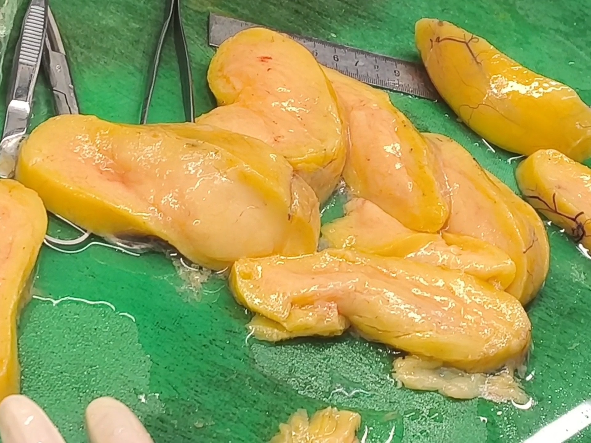 胸壁脂肪瘤!肿瘤体积较大,肿物切面已不在典型!脂肪瘤一般生长较为缓慢,但如果发现在短时期内突然增大,就需要切除了,如果置之不理,它可能会发生脂肪肉瘤样变!