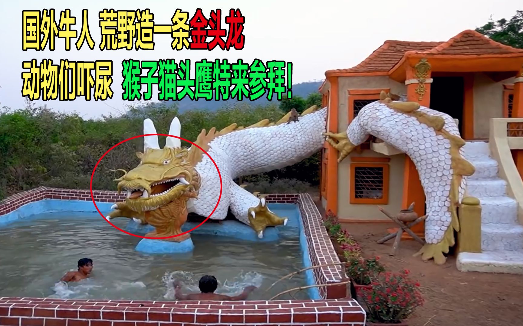 牛人荒野建造一条金龙,动物们吓尿,猴子猫头鹰都来参拜,纪录片